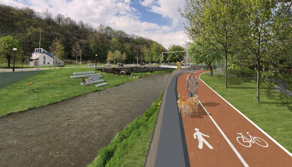 - O subtraversare inovatoare a podurilor CFR prin albia râului, utilizând un sistem modular de flotoare pentru continuitatea traseului ciclist.